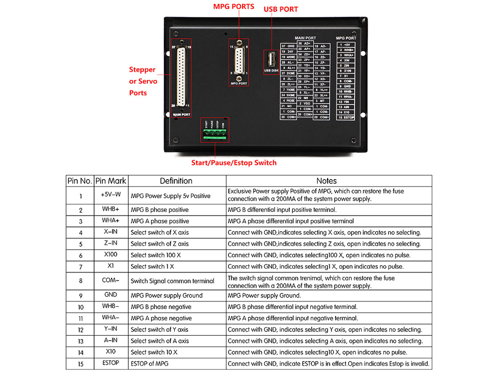 DDCS V3.1 sử dụng cổng DB15 (Cái) phía sau để kết nối với tay quay bù tay. Các chân bao gồm nguồn 5V, tín hiệu A, B cho encoder và các chân chọn trục (X, Y, Z, A), chọn hệ số nhân (x1, x10, x100).